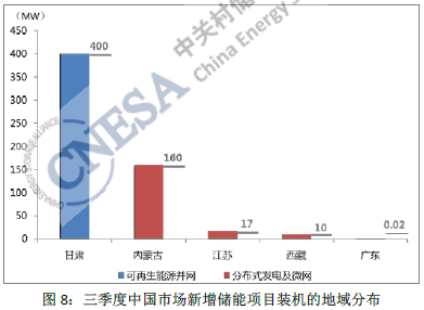 2016年三季度,中國新增儲能項目(含投運、在建、規(guī)劃中項目)中,甘肅的裝機(jī)規(guī)模最大,為400MW,占三季度新增裝機(jī)總規(guī)模的68%,并且全部應(yīng)用在可再生能源并網(wǎng)領(lǐng)域。