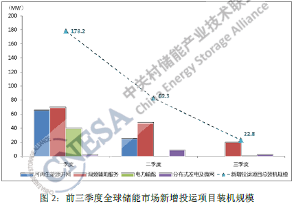 2016年三季度,中國新增投運項目3個,裝機(jī)規(guī)模1.5MW,同比增長50%,環(huán)比今年二季度下降了87%。項目全部集中在分布式發(fā)電及微網(wǎng)領(lǐng)域。
