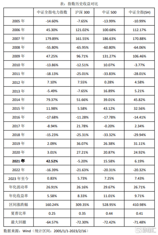 再來(lái)看過(guò)往收益率,據(jù)WIND統(tǒng)計(jì)顯示,自基日(2014年12月31日)以來(lái),截至2023年2月16日,中證全指電力指數(shù)年化收益率約5.6%,整體表現(xiàn)落后于大盤(pán)基準(zhǔn)(中證全指)。此外,該指數(shù)的年化波動(dòng)率為26.9%,同樣低于部分大盤(pán)指數(shù)。不過(guò)自2021年起,由于電力市場(chǎng)化改革的加速,該指數(shù)取得了42.5%的收益,遠(yuǎn)遠(yuǎn)領(lǐng)先其他大盤(pán)指數(shù)。同時(shí),其2022年的表現(xiàn)也領(lǐng)先大盤(pán)指數(shù)。