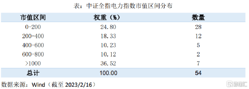 從市值分布來(lái)看,中證全指電力指數(shù)呈現(xiàn)較為明顯的中小盤(pán)特征,其中市值規(guī)模在400億之下的成份股權(quán)重合計(jì)占比為43%,數(shù)量達(dá)到40只。