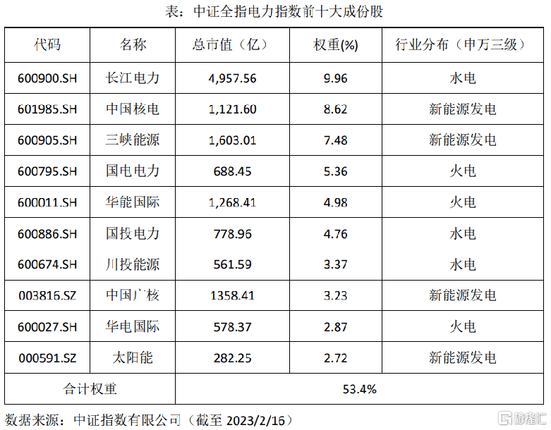 目前,中證全指電力指數(shù)(H30199.CSI)正是一個(gè)標(biāo)準(zhǔn)的電力行業(yè)指數(shù)---選取中證全指樣本股中的電力公用事業(yè)行業(yè)股票組成,以反映該行業(yè)股票的整體表現(xiàn)。據(jù)WIND統(tǒng)計(jì)顯示,截至2023年2月16日收盤(pán)計(jì),全指電力指數(shù)共包含54只成份股,平均個(gè)股市值434.64億元。
