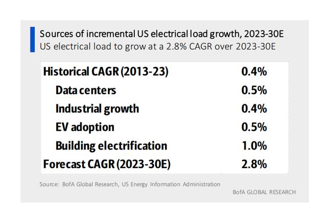 美銀美林在最新發(fā)布的研報中表示,隨著AI技術的飛速發(fā)展,美國電網(wǎng)的電力需求將面臨著前所未有的增長,預計2023年至2030年,美國電力需求將以2.8%的年復合增長率(CAGR)增長。