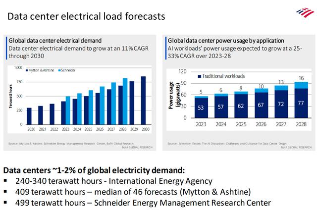 美銀美林預計,到2030年,數(shù)據(jù)中心的電力需求預計將以11%的復合年增長率增長。這相當于全球電力需求的約1-2%,即240-340太瓦時(1太瓦時等于10億千瓦時)。
