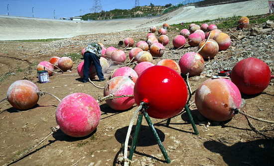 劉家峽水電廠壩前浮球阻攔系統(tǒng)是為防止船舶或人員靠近泄水區(qū)域發(fā)生意外事故而設(shè)置的安全防護設(shè)施和安全標(biāo)識,主要由浮球、浮箱、滑道、塔架、圍欄及連接鋼絲繩等部件組成。這次維修主要是對2019年汛后檢查中發(fā)現(xiàn)的30個已損壞下沉浮球、連接浮球的繩卡進行維修,對浮箱、鋼塔架和滑道等進行防腐處理以恢復(fù)其功能。