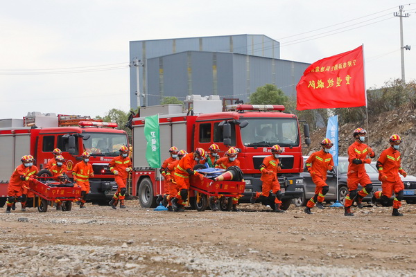 本次演練模擬背景是受強降雨影響,山體水分飽和,突發(fā)山體崩塌和滑坡地質(zhì)災(zāi)害險情,造成房屋被埋、人員被困情景。上午10點30分,應(yīng)急供電、現(xiàn)場搜救、專家勘察、救助傷員、衛(wèi)生消毒……現(xiàn)場的每支隊伍各司其職,相互配合,讓應(yīng)急演練有序地開展進行。