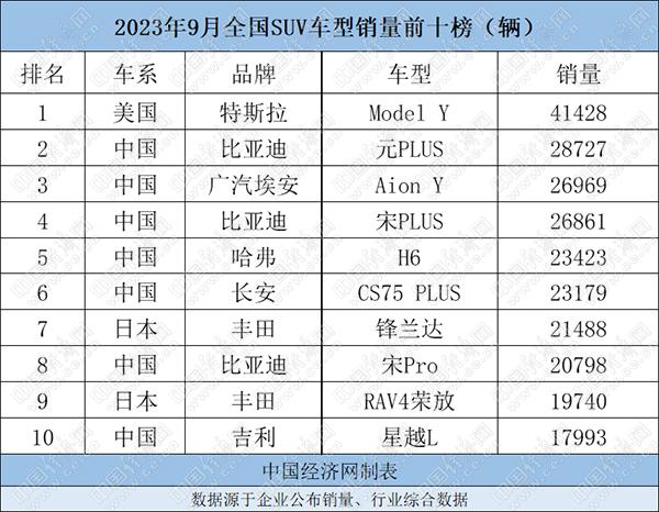 9月SUV:Model Y一馬當(dāng)先,比亞迪三車銷量超2萬輛