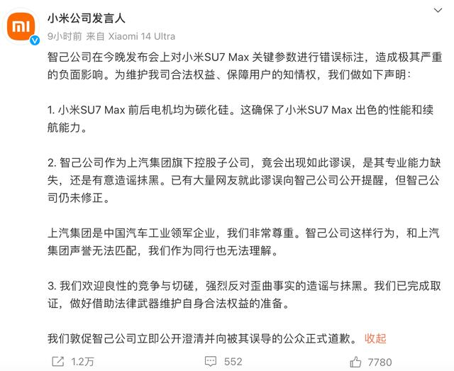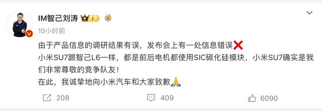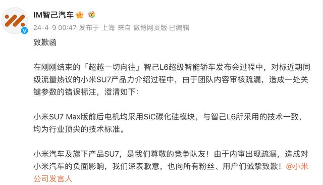 約半小時(shí)后,智己汽車終于在官方微博作出回應(yīng)稱,在剛剛結(jié)束的智己L6超級智能轎車發(fā)布會過程中,對標(biāo)近期同級流量熱議的小米SU7產(chǎn)品力介紹過程中,由于團(tuán)隊(duì)內(nèi)容審核疏漏,造成一處關(guān)鍵參數(shù)的錯(cuò)誤標(biāo)注,澄清如下:小米SU7 Max版前后電機(jī)均采用SIC碳化硅模塊,與智己L6所采用的技術(shù)一致,均為行業(yè)頂尖的技術(shù)標(biāo)準(zhǔn),“小米汽車及旗下產(chǎn)品SU7,是我們尊敬的競爭隊(duì)友!由于內(nèi)審出現(xiàn)疏漏,造成對小米汽車的負(fù)面影響,我們深表歉意,也向所有粉絲、用戶們誠摯致歉!”