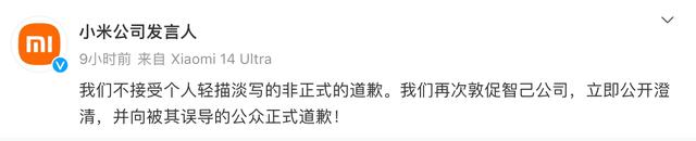 隨后小米公司發(fā)言人又針對前述劉濤的道歉補(bǔ)充說,“我們不接受個(gè)人輕描淡寫的非正式的道歉。我們再次敦促智己公司,立即公開澄清,并向被其誤導(dǎo)的公眾正式道歉!”