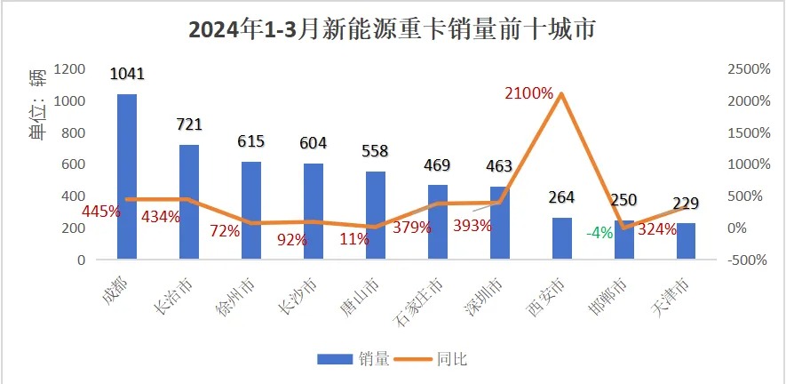 4月26日,記者從成都汽車產(chǎn)業(yè)聯(lián)盟獲悉,2024年一季度,全國(guó)新能源重卡銷量11075輛,銷量前10城市共銷售5214輛,占全國(guó)新能源重卡銷量的47.1%,成都市銷量排名第一,也是銷量唯一超1000輛的城市。