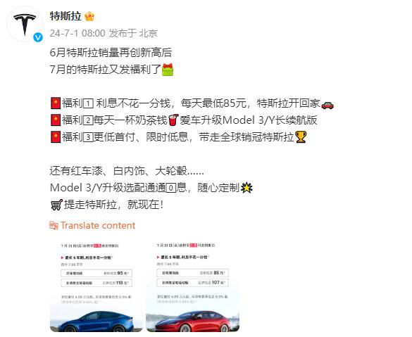7月31日前,針對(duì)Model 3/Y標(biāo)準(zhǔn)續(xù)航版推出的1~5年0息和低息優(yōu)惠購車政策,日供低至85元起;針對(duì)Model 3/Y長(zhǎng)續(xù)航全輪驅(qū)動(dòng)版推出的1~5年0息和低息購車優(yōu)惠政策,日供低至107元起;特斯拉將7月限時(shí)低息的年費(fèi)率降至0.5%起(折合年化利率0.93%起)。