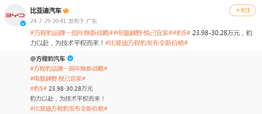 7月29日晚間,比亞迪旗下方程豹宣布品牌一周年煥新戰(zhàn)略,“豹5”車型上線全新價格,售價區(qū)間現(xiàn)為23.98萬元—30.28萬元。