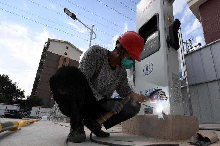 8月15日,在湖畔嘉苑麗景苑東北角停車場新能源汽車充電樁城市基礎(chǔ)配套設(shè)施停車場,施工人員正對45個(gè)充電樁進(jìn)行最后的安裝調(diào)試。