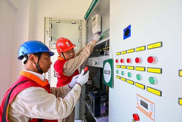 6月18日,國家電網江蘇電力(金湖飛虎)共產黨員服務隊隊員在金北街道萬莊校東泵站裝表接電,為農田插秧抗旱提供可靠電力保障