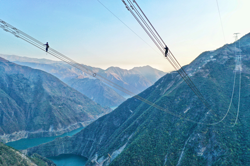 國網(wǎng)四川電力員工在白鶴灘—浙江特高壓工程施工現(xiàn)場展放導(dǎo)線。