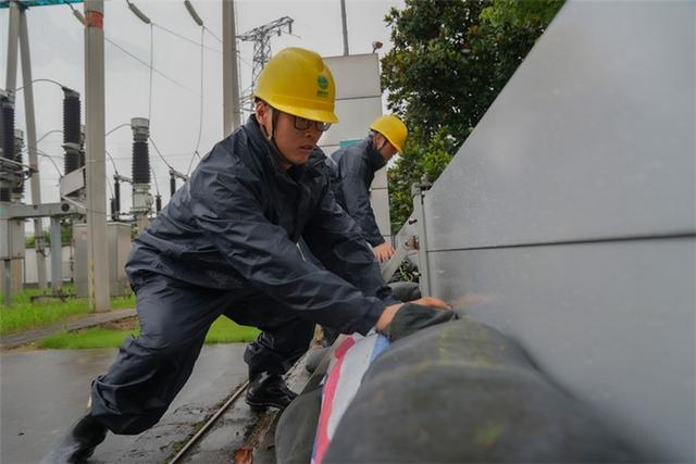 國網(wǎng)安徽安慶岳西縣供電公司員工裝沙袋加固城西變電站圍墻,防范臺(tái)風(fēng)影響變電站設(shè)備安全運(yùn)行。