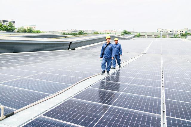 南方電網(wǎng)廣東東莞供電局工作人員為企業(yè)新裝的光伏發(fā)電項目服務,助力企業(yè)綠色低碳發(fā)展。鐘肖如 攝