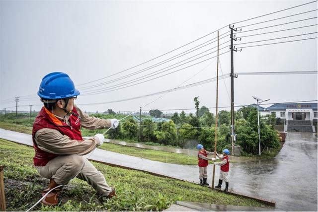 國(guó)網(wǎng)浙江衢州供電公司員工在林山鄉(xiāng)霞湖村冒雨搶修受損線路。