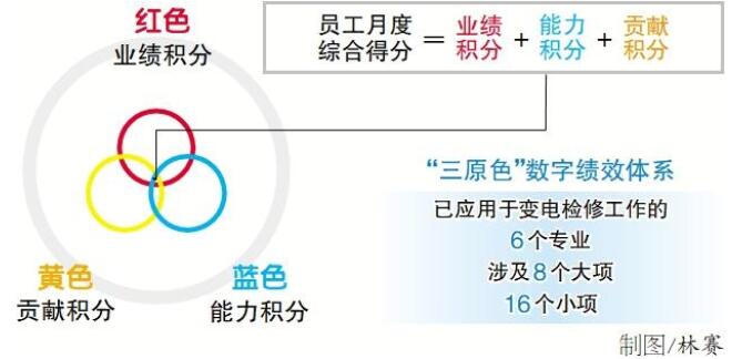 杭州供電公司為適應(yīng)企業(yè)轉(zhuǎn)型升級要求,樹立“工資靠掙、業(yè)績靠干”績效理念,于今年2月8日起在變電檢修中心221名員工績效考核工作中試點應(yīng)用“三原色”數(shù)字績效體系。紅、藍(lán)、黃三原色分別代表衡量工作量的業(yè)績積分、衡量工作能力的能力積分和衡量貢獻(xiàn)大小的貢獻(xiàn)積分。其中,業(yè)績積分又分為安全積分和工單積分。每名員工每個月的綜合得分都由該中心的績效管理員基于業(yè)績、能力、貢獻(xiàn)三個維度計算得出,以實現(xiàn)薪酬多勞多得、能者多得。