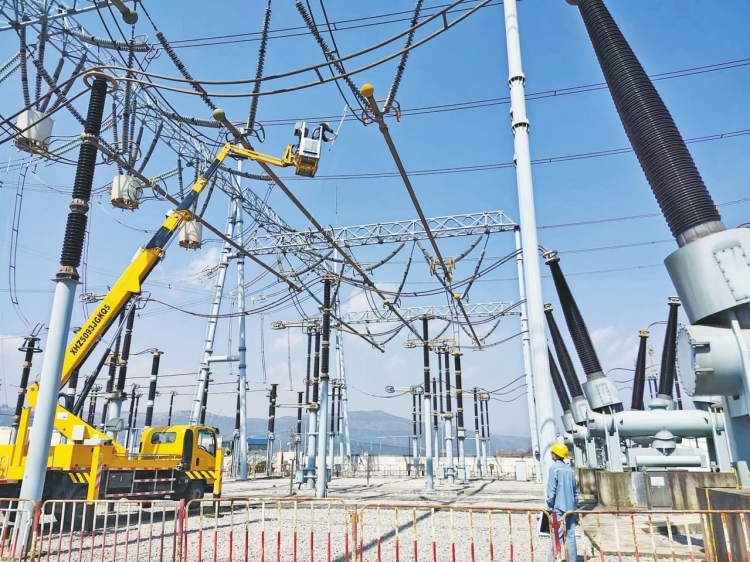 工作人員對(duì)220千伏草鋪?zhàn)冸娬倦[患母線進(jìn)行更換。 盧顯侖 攝