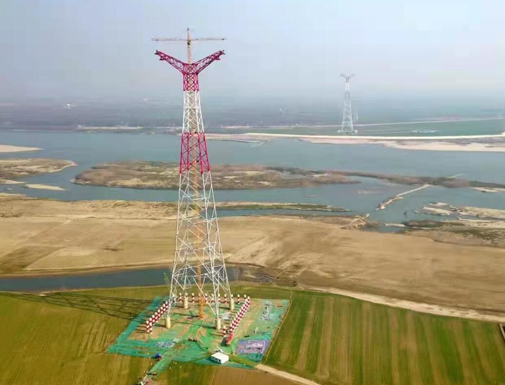 2021年12月28日,在湖北省鐘祥市磷礦鎮(zhèn)、鐘祥市豐樂鎮(zhèn)漢江之畔,歷經(jīng)50余天的建設(shè),由國網(wǎng)湖北送變電工程有限公司承建的白鶴灘~江蘇±800千伏特高壓直流輸電線路工程(鄂7標(biāo)段)鐘祥漢江大跨越兩基跨越塔N5044 、N5045組立完成。(李健波、郭暉 攝)
