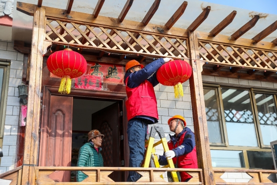 2月6日,國網(wǎng)北京門頭溝供電公司妙峰山供電所員工在炭廠村開展春節(jié)保電走訪,到獨居老人家檢查“煤改清潔能源”用電設(shè)備,幫助掛紅燈籠。(張文靜 攝)