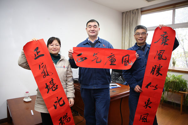 寧柏偉給該公司總經(jīng)部、財務部、燃運部、思政部、前期辦以及法律(風控)事務部等部門贈送了廉潔春聯(lián)。每到一處,寧柏偉親自將春聯(lián)送到各部門負責人手中,并合影留念表達新年祝福。他談到,此次送廉政春聯(lián)活動,該公司紀委首次將范圍擴大到全體部門,通過開展為部門送廉政春聯(lián)活動,寓教于樂,宣傳廉政紀律,提醒領(lǐng)導干部員工時刻繃緊廉潔自律線,清廉、祥和過春節(jié);同時將廉政文化元素融入春聯(lián)之中,展示了中國傳統(tǒng)文化,以喜慶的形式弘揚清風正氣,傳遞廉潔正能量。