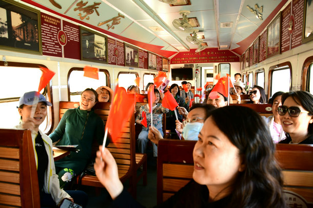 車廂內(nèi)女職工們一邊欣賞沿途美景,一邊自由暢談?!饵h史知識》、《女職工勞動保護特別規(guī)定》環(huán)節(jié)大家爭先恐后舉手,氣氛熱烈有趣,在搶答過程中既學習到黨史知識又增添了學習的趣味。全體人員集體合唱《我和我的祖國》,在歌聲中現(xiàn)場氣氛達到了高潮。下車后,大家來到黨建主題廣場參觀學習。