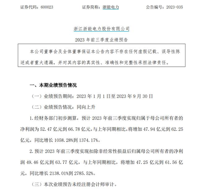 浙能電力稱,經(jīng)財務(wù)部門初步測算,預(yù)計2023年前三季度實(shí)現(xiàn)歸屬于母公司所有者的凈利潤為52.47億元到66.78億元,與上年同期相比,將增加47.94億元到62.25億元,同比增長1058.28%到1374.17%。預(yù)計2023年前三季度實(shí)現(xiàn)扣除非經(jīng)常性損益后歸屬母公司所有者的凈利潤49.46億元到63.77億元,與上年同期相比,將增加47.25億元到61.56億元,同比增長2138.01%到2785.52%。