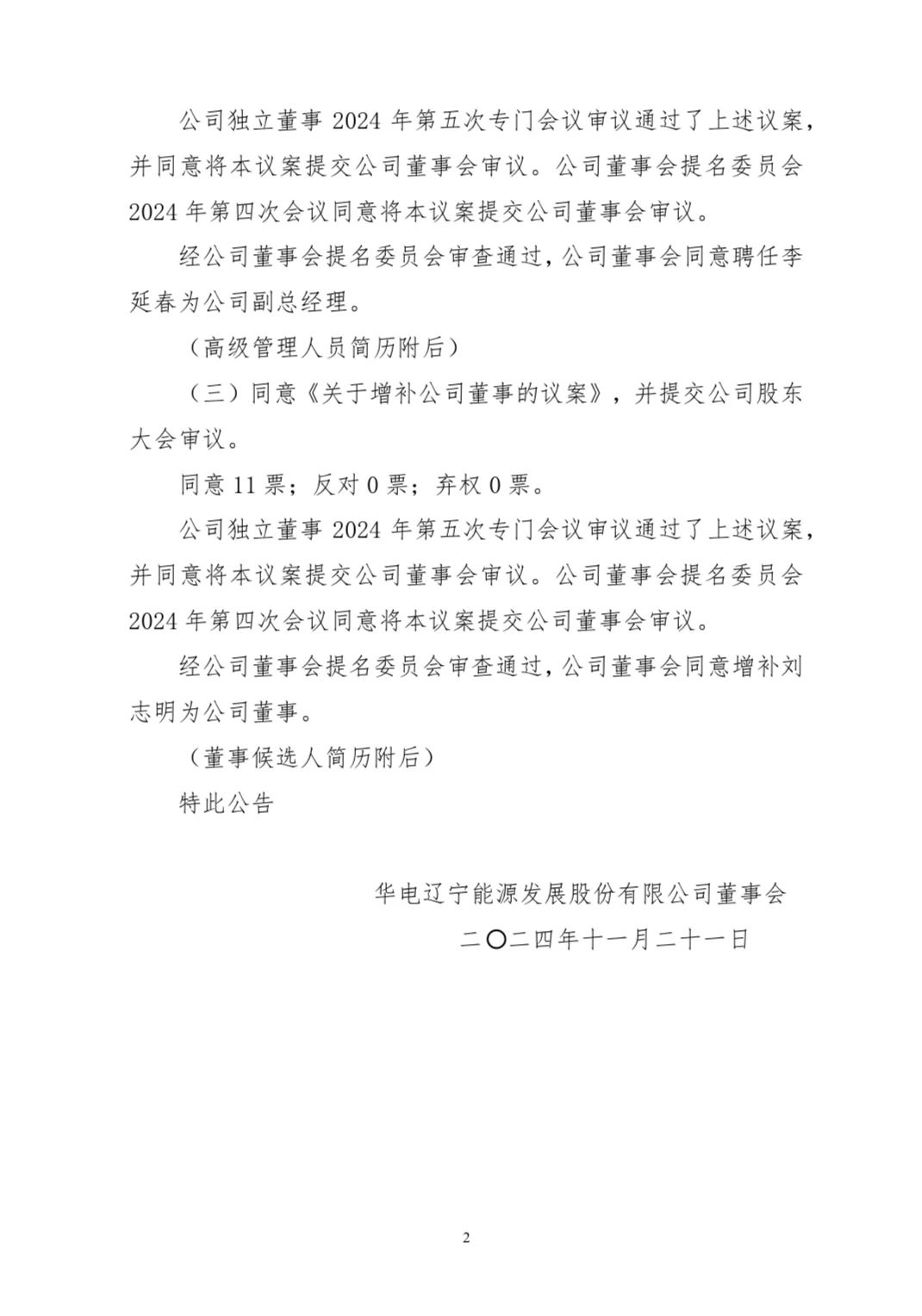 11月21日,華電遼能發(fā)布公告稱,公司于11月20日以現場和通訊方式召開了第八屆董事會第十九次會議,同意《關于聘任公司高級管理人員的議案》經公司董事會提名委員會審查通過,公司董事會同意聘任李延春為公司副總經理;同意《關于增補公司董事的議案》,并提交公司股東大會審議。經公司董事會提名委員會審查通過,公司董事會同意增補劉志明為公司董事。