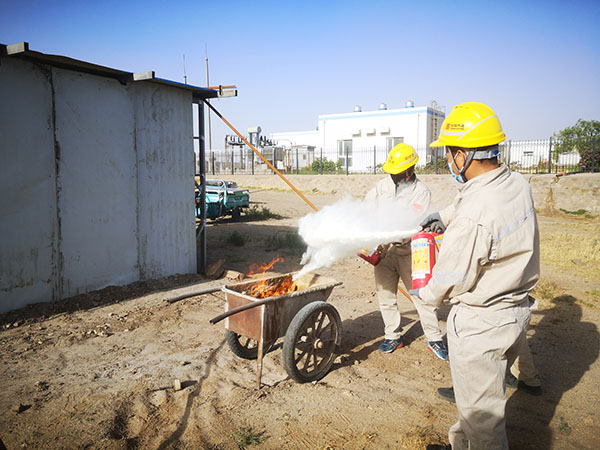 首先開展的是干粉滅火器實操演練。運維人員取出4具即將送檢的滅火器,用小推車裝好干柴放置在空曠地點,駐站人員講解了滅火器檢查方法和使用流程后,在確保安全的情況下將小推車內(nèi)的干柴點燃。一名工作人員用滅火器將車內(nèi)的火焰撲滅,再重新點燃,下一名人員繼續(xù)操作,最終達到參訓(xùn)人員全部能夠熟練使用滅火器的目的;其次,開展正壓呼吸器使用實操演練。在每個人都熟練掌握說明書上使用步驟和注意事項后,每名工作人員都穿戴正壓呼吸器一次,如果穿戴流程錯誤立即糾正并重新穿戴;再次,開展消防戰(zhàn)斗服穿戴實操演練。有火電消防工作經(jīng)驗的人員對戰(zhàn)斗服使用步驟進行詳細講解,每名工作人員都穿戴消防戰(zhàn)斗服一次,達到全員均能熟練穿戴的目的;最后,所有參訓(xùn)人員都組裝并佩戴防毒面具一次。