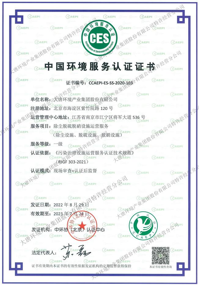大唐環(huán)境特許經(jīng)營分公司獲得“一級(jí)除塵脫硫脫硝設(shè)施運(yùn)營服務(wù)”認(rèn)證