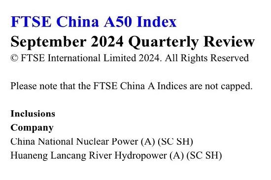 富時羅素(FTSE Russell)9月4日宣布對富時中國A50指數(shù)進行季度審核變更,納入華能水電等兩只股票,本次變更于9月20日生效。在今年8月,華能水電股票也被納入明晟(MSCI)中國指數(shù)。