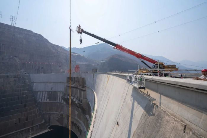 經(jīng)過數(shù)小時(shí)的緊張操作,世界上最長的低熱混凝土芯樣從白鶴灘壩體高程796.76米處取緩緩拔出,直至提升到高程833.5米脫離壩體,共穿過13個(gè)澆筑倉號(hào),73個(gè)澆筑坯層,25層冷卻水管,最終順利取出并成功吊裝固定。