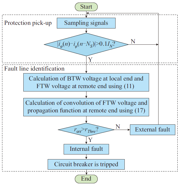 典型的換流器故障控制策略雖能弱化故障特征,但在故障暫態(tài)階段,故障特征主要受到海纜中電容和電感間能量交換的影響。同時(shí),換流器控制系統(tǒng)完成指定目標(biāo)需要一定時(shí)間,因此故障支路電流在故障暫態(tài)階段幅值較大并逐漸減小。充分利用該階段的故障信息,即可實(shí)現(xiàn)故障識(shí)別。鎧裝三芯海纜包含導(dǎo)芯、金屬屏蔽層和鎧裝,多導(dǎo)體之間存在電磁耦合,單獨(dú)分析相電氣量困難。對(duì)此,首先利用時(shí)域暫態(tài)信號(hào)相模變換,篩選出能夠反映各種故障類型的模量。Marti模型考慮了線路頻變特性,能夠根據(jù)對(duì)端電壓前行波準(zhǔn)確計(jì)算本端電壓反行波。為了在低采樣率下實(shí)現(xiàn)計(jì)算,推導(dǎo)了基于插值的高精度電壓反行波電壓表達(dá)式?;陔妷悍葱胁ú町惖暮I巷L(fēng)電低頻輸電系統(tǒng)海纜縱聯(lián)保護(hù)方案流程圖如圖2所示。保護(hù)啟動(dòng)后,首先根據(jù)本端模量信息計(jì)算本端電壓反行波,然后通過(guò)對(duì)端電壓前行波與傳播函數(shù)間的卷積來(lái)計(jì)算本端電壓反行波,最終比較二者差異以實(shí)現(xiàn)海纜保護(hù)。