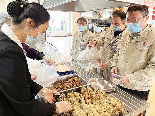 經(jīng)過大廚們精心烹制的色、香、味集于一身的各種熟食,深受職工的喜愛,供不應求,剛一出鍋就被搶購一空。“今年的魚炸的特別香,昨天買回去兩個孩子都搶著吃,今天打算再多買幾條”“今年過年不回家了,和爸媽通了視頻電話,他們看到單位條件這么好,心里很放心”“公司為我們準備了物美價廉的‘年貨’,雖然今年堅守崗位不回家過年,卻讓我們真真切切感受到了家的溫暖,真得很暖心”大伙兒拎著買到的年貨紛紛說道。