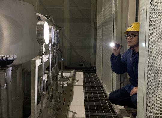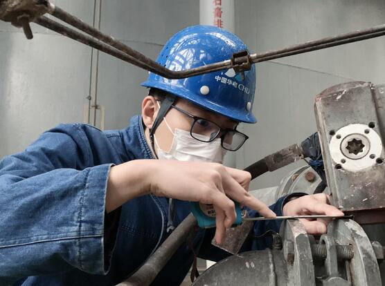亓航正在該公司三號吸收塔B石膏排出泵排凈門檢修(圖:劉云龍)
