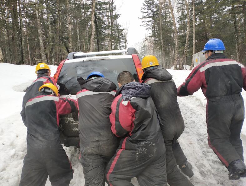 見此情形,大家拿出鐵鍬沿著車輪行駛的方向?qū)⒎e雪清理干凈,幾經(jīng)周折,車終于從泥濘中開了出來。