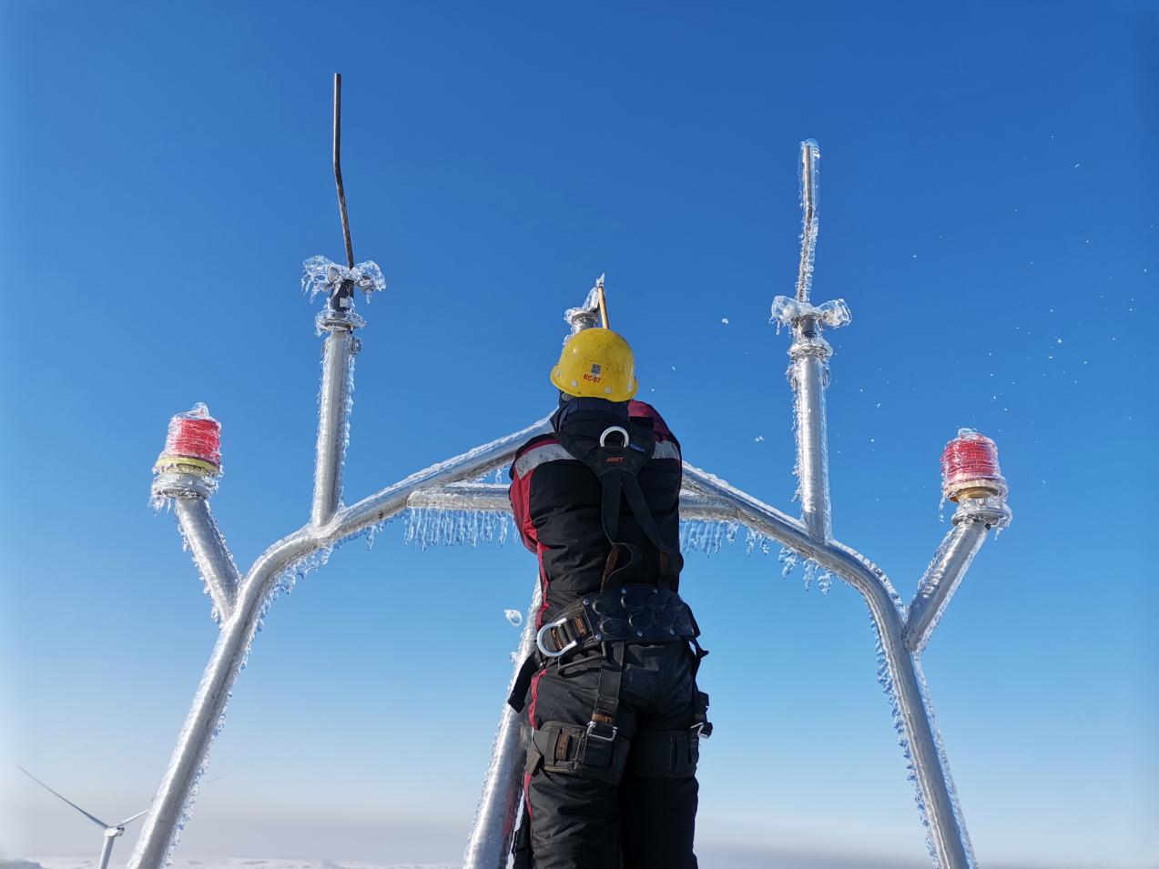 11月11日至12日,陽光透過薄薄的云層,照耀著白茫茫的大地,反射出銀色的光芒。風(fēng)機(jī)逐漸恢復(fù)運(yùn)行,在重力和風(fēng)機(jī)葉片旋轉(zhuǎn)的作用下,裹冰會從葉片上脫落,由于受旋轉(zhuǎn)葉片的離心力作用,這些冰在沒有障礙物遮擋的情況下會被拋出數(shù)百米遠(yuǎn),存在安全隱患。風(fēng)電場隨即組織人員挨家挨戶告訴村民,近期不得靠近風(fēng)機(jī),注意人身安全。之后開展機(jī)組風(fēng)速儀、風(fēng)向標(biāo)除冰工作,全面降低機(jī)組不可用時(shí)間,保障機(jī)組供電穩(wěn)定可靠。本次除冰消缺充分利用上海電氣風(fēng)機(jī)監(jiān)控系統(tǒng)后臺,通過對比機(jī)組風(fēng)速和風(fēng)向、功率等數(shù)據(jù),分析判斷機(jī)組覆冰情況,對因雨雪冰凍天氣導(dǎo)致的風(fēng)速儀、風(fēng)向標(biāo)覆冰從而影響機(jī)組功率的問題,及時(shí)派出“破冰突擊隊(duì)”。但是機(jī)艙頂部由于積雪、結(jié)冰,變得十分光滑。工作人員佩戴好安全帶,掛好雙鉤,迎難而上,勇敢破冰。同時(shí)也對加熱器、溫度傳感器及相關(guān)回路進(jìn)行細(xì)致檢查,對無法正常運(yùn)行的加熱器進(jìn)行及時(shí)更換,確保設(shè)備加熱良好,回路接線無松動(dòng),風(fēng)速儀、風(fēng)向標(biāo)工作正常。