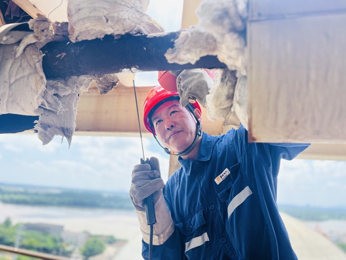 在南熱廠區(qū),老員工湯勝寶正帶領(lǐng)著他的工作小組,為鋪排管道做準(zhǔn)備工作,他還有不到一年的時(shí)間就要退休,但他仍然老當(dāng)益壯,在室外43度以上的烈日下,肩扛手抬著一根根鋼管。幾根鋼管抬放就位后,他累得滿臉是汗,氣喘吁吁,但他性格要強(qiáng),不服老,依然說著:沒事,這點(diǎn)活算不了什么。