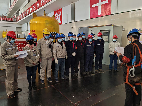 拆除工作開始前,專業(yè)人員、檢修人員、監(jiān)理人員三方按照編制的專項吊裝方案認真核對檢修措施,重點對主橋機供電系統(tǒng)、起升系統(tǒng)、吊具進行檢查。同時組織工作負責人和工作班成員現(xiàn)場開展三講一落實活動,著重對本次吊裝作業(yè)過程中存在的風險點和預控措施進行現(xiàn)場講解。燈泡頭拆除過程中,由于尺寸原因泡頭與定子基座把合螺栓松開后,未能按照預期直接放置到專用工具上。檢修指揮部現(xiàn)場研究方案,轉(zhuǎn)變思路,采用單側(cè)著力再逐步調(diào)整另一側(cè)的方案,把干涉區(qū)域盡量避開,整個拆除吊裝歷時5個小時順利完成。拆除吊運期間,該公司各級人員到位監(jiān)督,有效保障了安全措施齊全可靠?,F(xiàn)場檢修人員充分發(fā)揚團結(jié)協(xié)作、不怕吃苦、奮勇拼搏的工作精神,本著精益求精的工作態(tài)度,嚴格執(zhí)行安全規(guī)程、檢修工藝和工序,確保了整個拆除工作萬無一失。