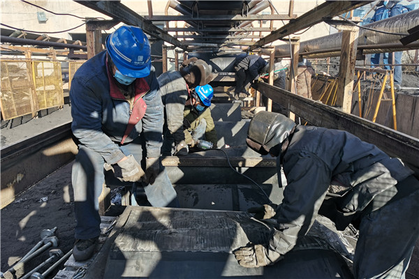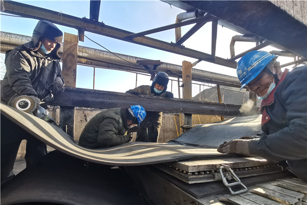 5日上午,工作人員做好粘接皮帶準(zhǔn)備工作,負責(zé)這次搶修工作的皮帶班,目前編制只有三名職工,承擔(dān)此次工作,顯然兩天內(nèi)完不成皮帶粘接任務(wù),燃運分場打破常規(guī),合理分配人員,調(diào)派分場其他班組支援搶修,在剛剛完成三天搶修任務(wù)的情況下,克服困難繼續(xù)投入到搶修中。他們分工作業(yè)、分組負責(zé),一組用電火焊、導(dǎo)鏈、撬棍等工具修復(fù)皮帶滾筒,一組對斷裂皮帶進行切割、打磨、對口、清洗、粘接和硫化等處理,同樣是在室外寒冷天氣搶修,汗水浸濕了他們的衣領(lǐng)和帽子,加上空間狹小,他們克服了重重困難,團結(jié)作戰(zhàn),中午來不及休息,午飯后又繼續(xù)搶修工作,沒有一個人叫苦叫累,以頑強的毅力完成了當(dāng)天的皮帶粘接任務(wù)。