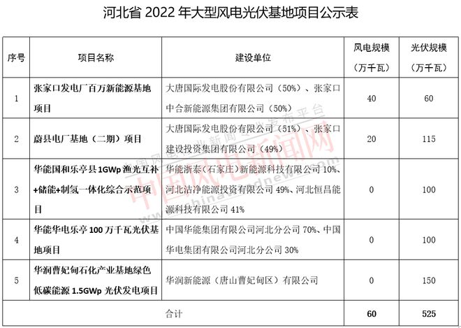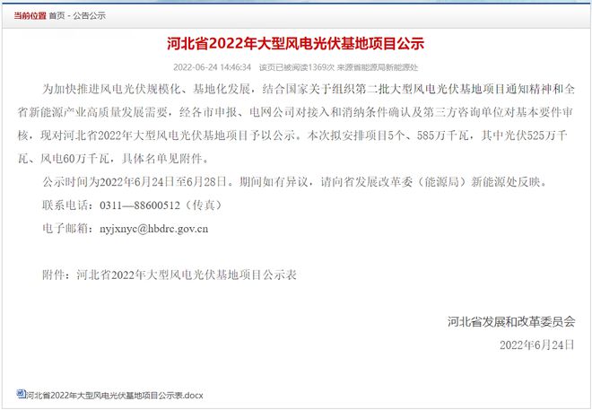 6月24日,河北省2022年大型風電光伏基地項目公示,涉及項目5個、585萬千瓦,其中光伏525萬千瓦、風電60萬千瓦。