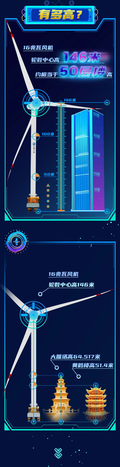 此次下線的單機容量16兆瓦海上風電機組,葉輪直徑252米,葉輪掃風面積約5萬平方米,約相當于7個標準足球場大;輪轂高度達146米,約相當于一座50層大樓的高度。在額定工況下,單臺機組每轉動一圈可發(fā)電34.2千瓦時。根據(jù)多年平均發(fā)電量設計值,單臺機組每年可輸出超過6600萬千瓦時的清潔電能,能夠滿足3.6萬戶三口之家一年的生活用電,可節(jié)約標煤約2.2萬噸,減排二氧化碳約5.4萬噸。