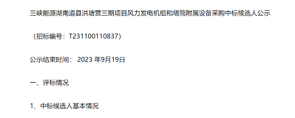 9月14日,中國三峽電子采購平臺發(fā)布《三峽能源湖南道縣洪塘營三期項目風力發(fā)電機組和塔筒附屬設備采購中標候選人公示》的公告。