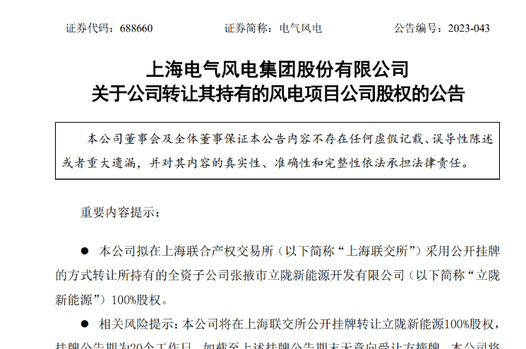 10月21日,上海電氣風(fēng)電集團(tuán)股份有限公司(以下簡(jiǎn)稱“電氣風(fēng)電”或“公司”)發(fā)布《關(guān)于公司轉(zhuǎn)讓其持有的風(fēng)電項(xiàng)目公司股權(quán)的公告》。