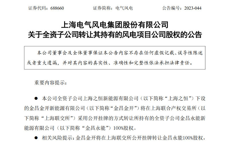 同日,電氣風(fēng)電發(fā)布《關(guān)于全資子公司轉(zhuǎn)讓其持有的風(fēng)電項(xiàng)目公司股權(quán)的公告》,電氣風(fēng)電全資子公司上海之恒下設(shè)的金昌金開將在上海聯(lián)合產(chǎn)權(quán)交易所采用公開掛牌的方式轉(zhuǎn)讓所持有的全資子公司金昌永能新能源有限公司(以下簡(jiǎn)稱“金昌永能”)100%股權(quán),金昌永能持有金昌風(fēng)電項(xiàng)目(裝機(jī)容量為100MW)。