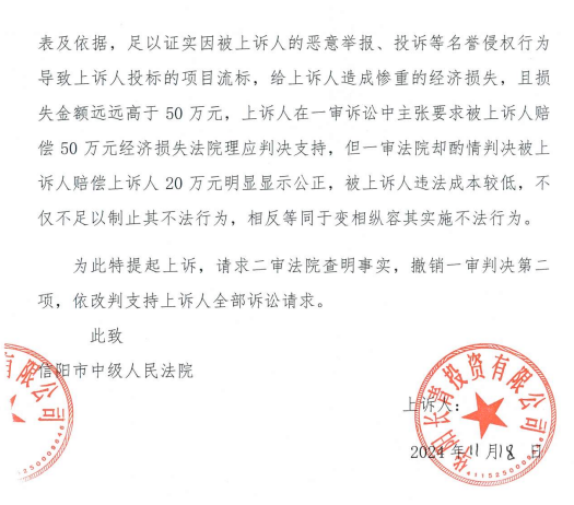 8、2024年11月18日,華陽長青公司提交《上訴狀》(依據(jù)第一個判決書,上訴已超時),請求“1、依法撤銷固始縣人民法院做出的(2024)豫1525 民初 6011號民事判決第二項,依法改判被上訴人賠償上訴人因被上訴人侵權(quán)而給上訴人造成的經(jīng)濟損失50萬元;維持判決第一項;2、上訴費用由被上訴人承擔(dān)。”
