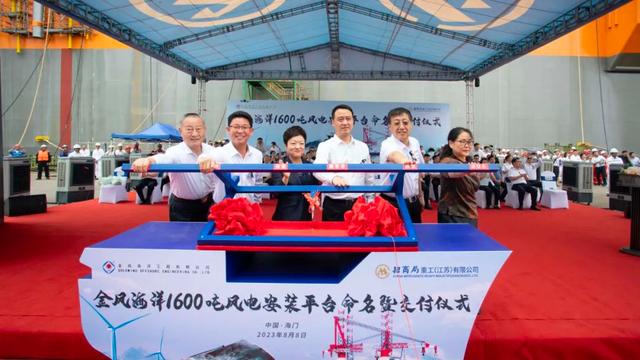 8月8日,新一代深遠(yuǎn)海1600噸風(fēng)電安裝平臺“中天31”命名暨交付儀式在江蘇南通舉行。南通市委副書記、代市長張彤,陽江市委副書記、市長余金富,招商局工業(yè)集團(tuán)黨委副書記、副總經(jīng)理吳四川,金風(fēng)科技集團(tuán)董事長武鋼,中天科技集團(tuán)董事長薛濟萍,以及三峽集團(tuán)、國家電投集團(tuán)、中廣核新能源公司等客戶代表出席儀式。