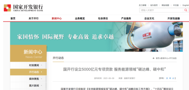 近期,國(guó)家開(kāi)發(fā)銀行制定《支持能源領(lǐng)域?qū)崿F(xiàn)“碳達(dá)峰、碳中和”戰(zhàn)略目標(biāo)工作方案》,“十四五”期間設(shè)立總規(guī)模為5000億元(等值人民幣,含外匯)的能源領(lǐng)域“碳達(dá)峰、碳中和”專項(xiàng)貸款,其中2021年安排發(fā)放1000億元,助力構(gòu)建清潔低碳安全高效的能源體系。
