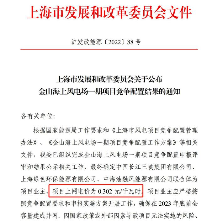 今年4月,上海市發(fā)改委公布了金山海上風(fēng)電場一期項(xiàng)目競爭配置結(jié)果,最終確定中國長江三峽集團(tuán)有限公司、上海綠色環(huán)保能源有限公司、中海油融風(fēng)能源有限公司聯(lián)合體為項(xiàng)目業(yè)主,項(xiàng)目上網(wǎng)電價(jià)為0.302元/千瓦時(shí)。